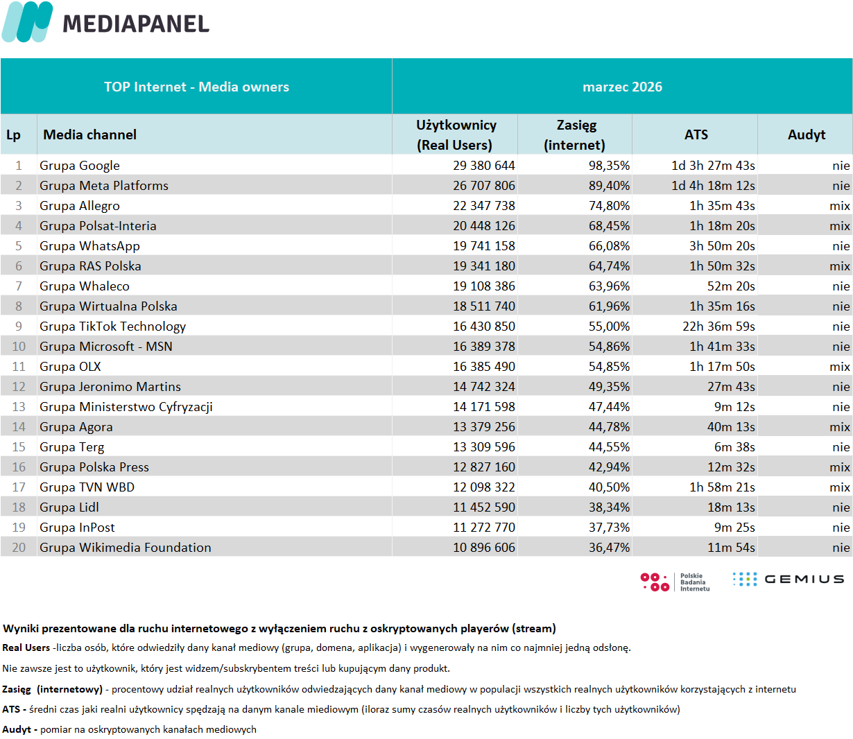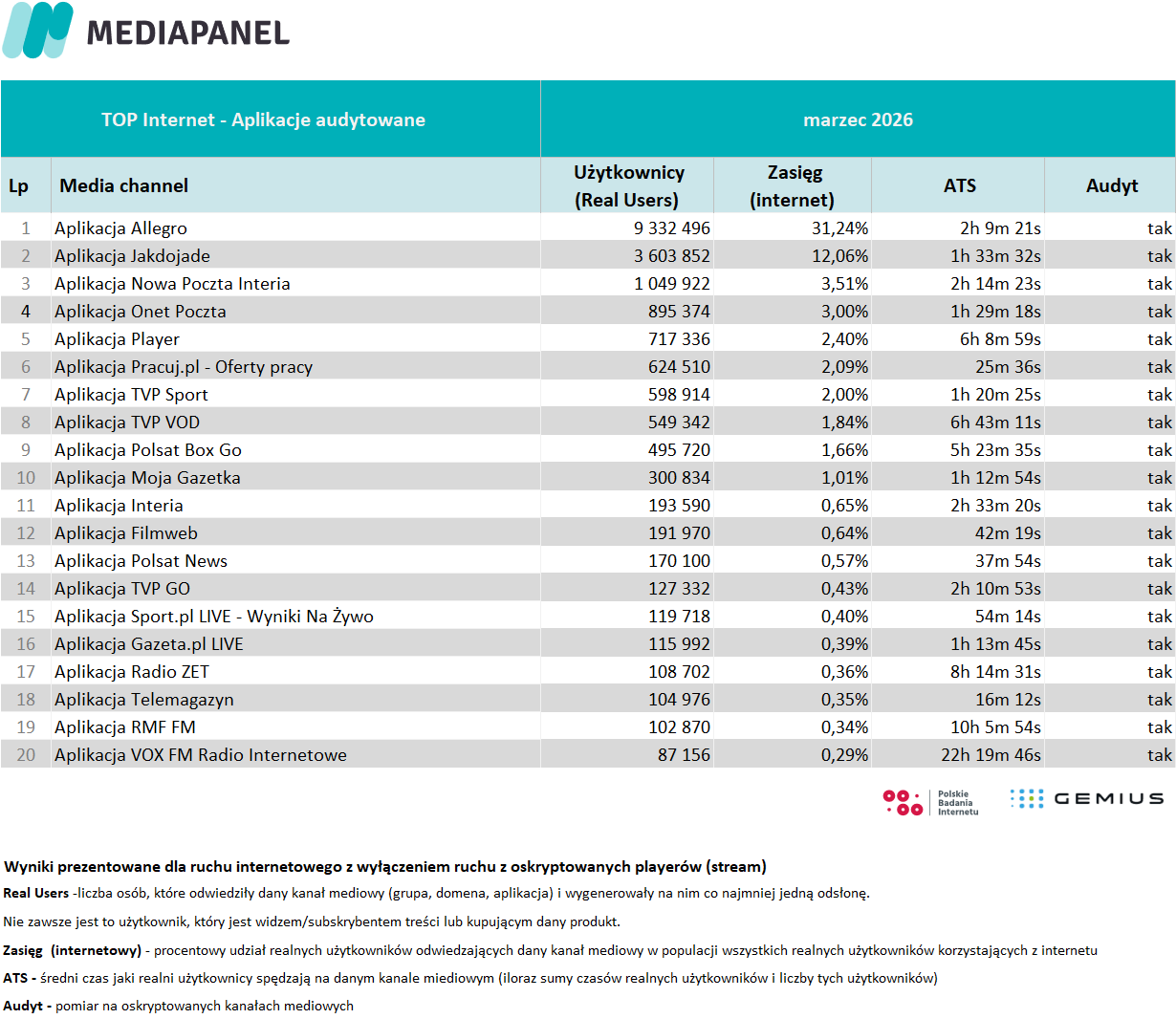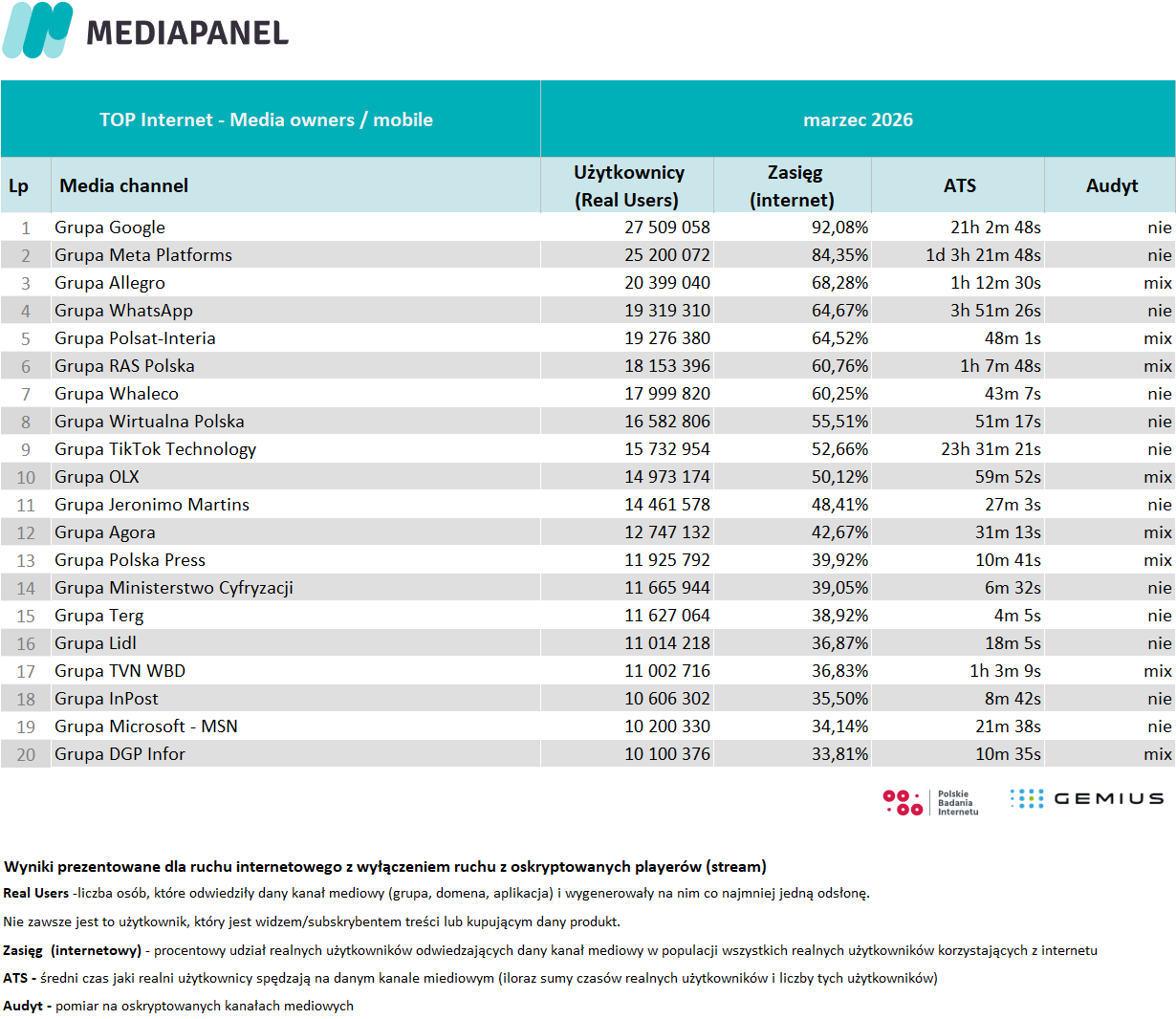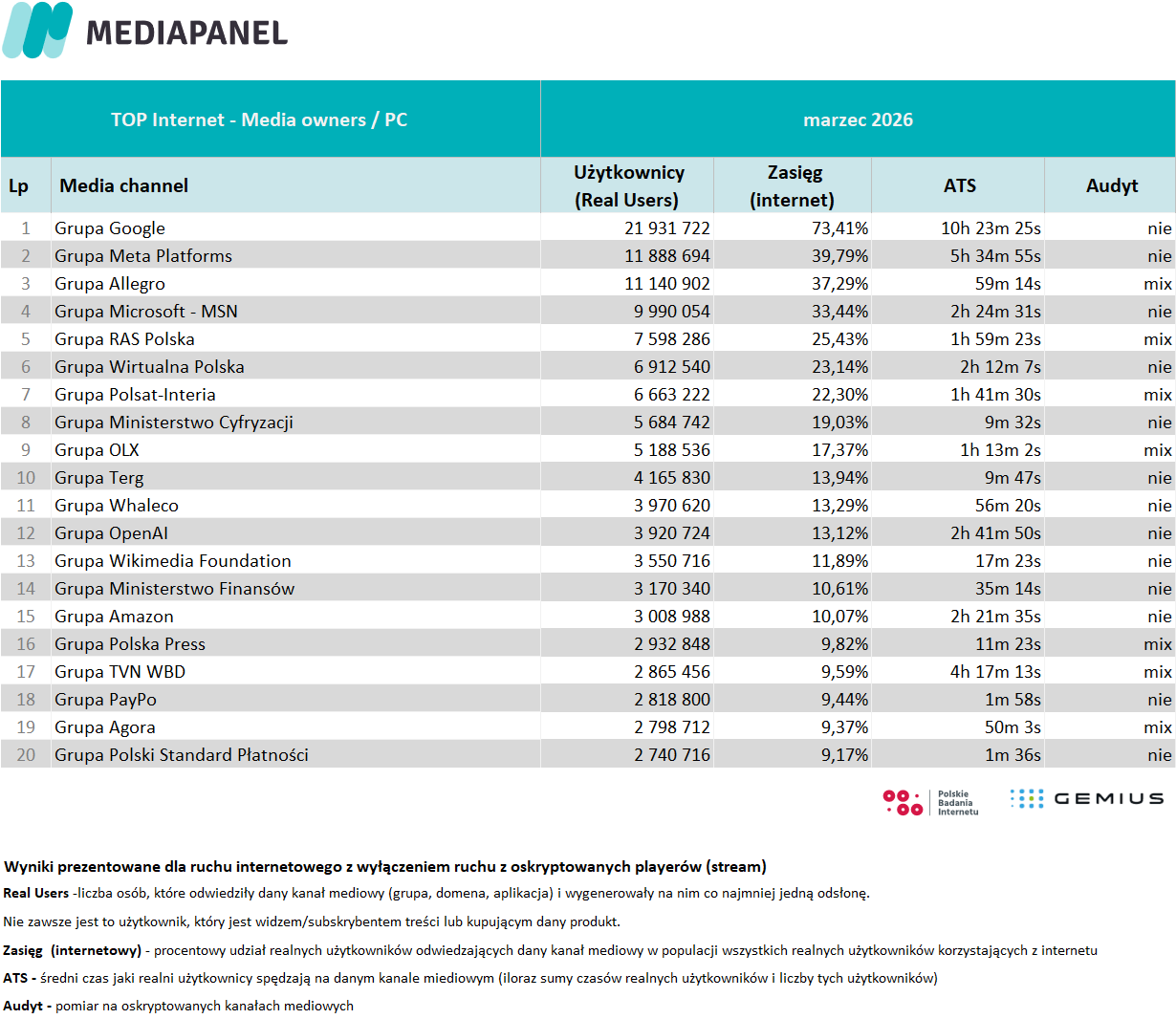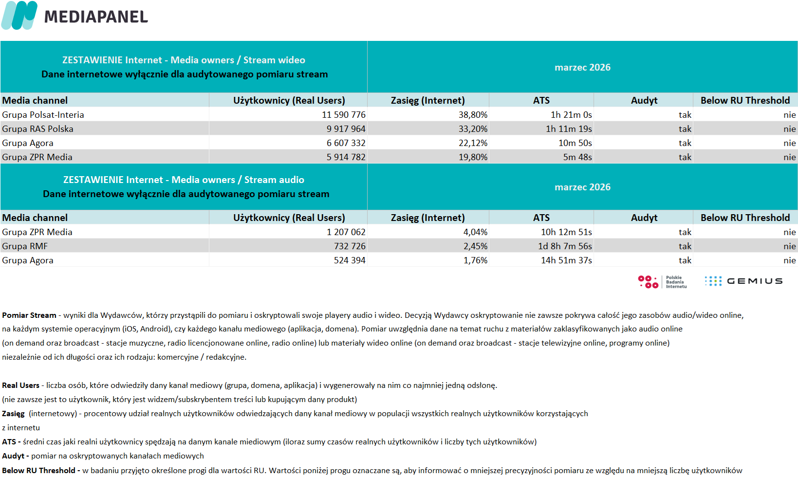 Poniżej prezentujemy szczegółowe zagregowane miesięczne dane pochodzące z badania internetu: rankingi wydawców i witryn internetowych oraz aplikacji. Prezentujemy również zestawienie audytowanych playerów audio i wideo – ich wyniki pokazujemy w agregacji do grup mediowych, biorących udział w badaniu.