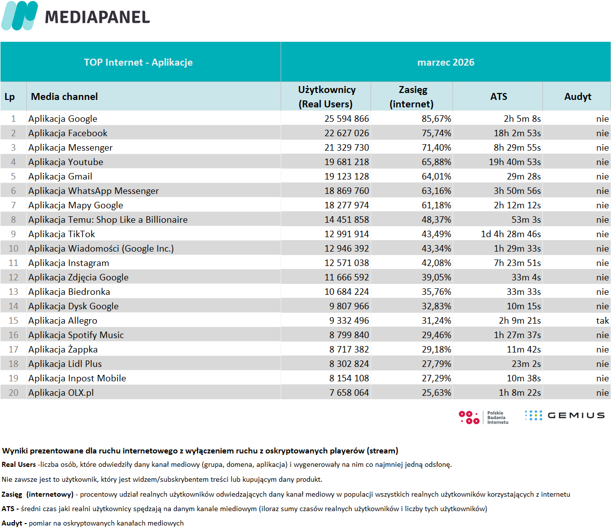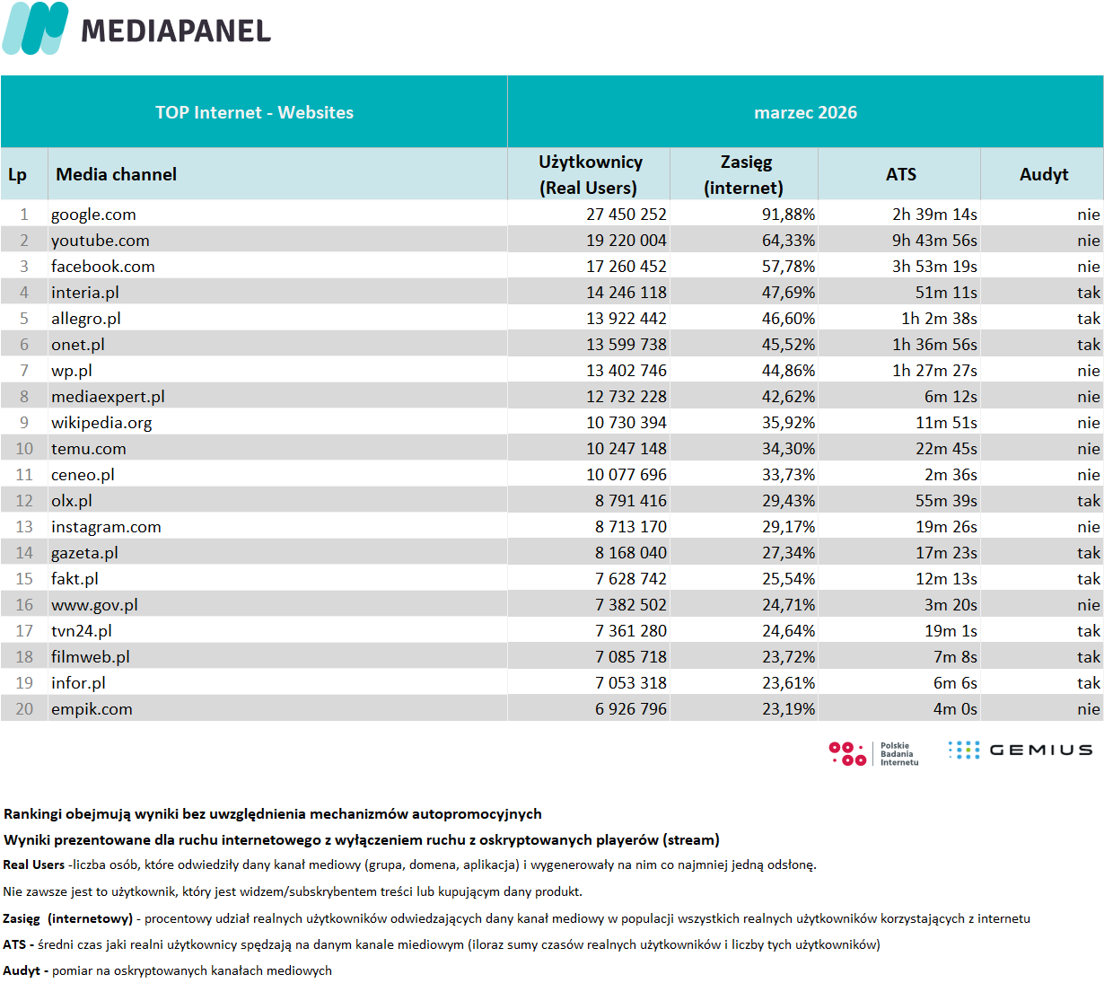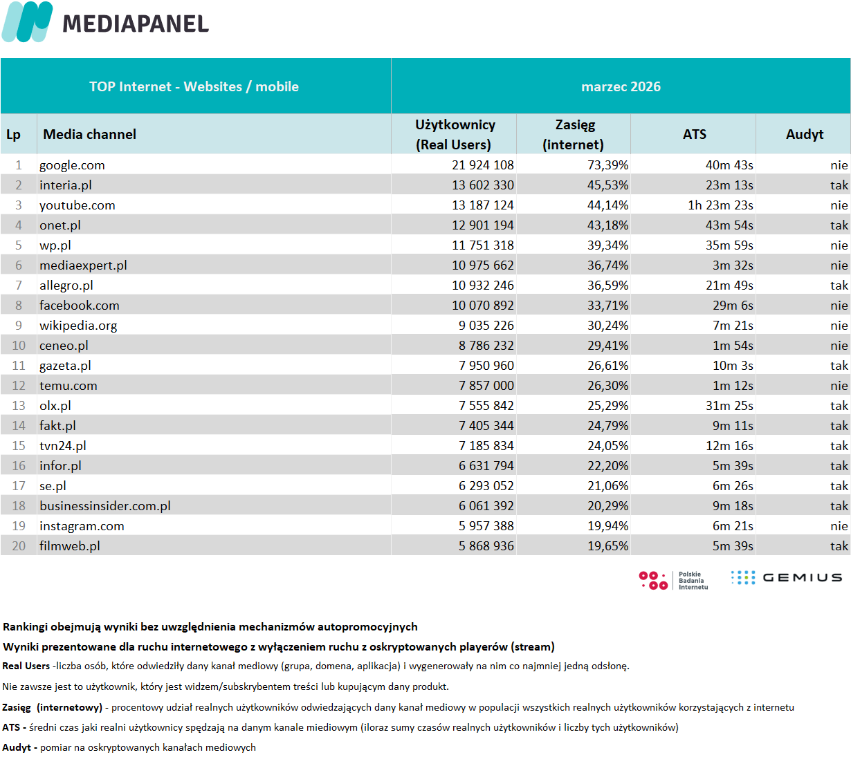 W marcu liczba internautów wyniosła 29,8 mln. Średnio dziennie korzystało z tego medium 26,8 mln osób.